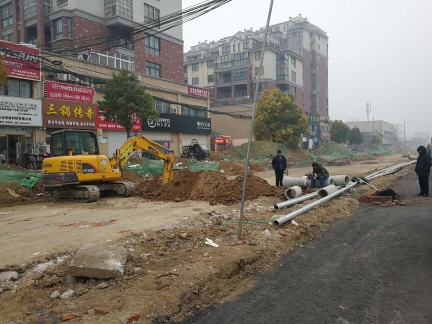 記者今日走訪漢陽路中段(穎河路-建設(shè)路)看到,目前該路段機(jī)動(dòng)車道已鋪上黑色的混凝土物質(zhì),人行道則是壓實(shí)過的土路。壓路機(jī)等設(shè)備停靠在道路兩頭,并未啟動(dòng),有兩臺(tái)挖掘機(jī)及數(shù)十名工人在人行道上,鋪設(shè)下水道。施工路段內(nèi),有不少菜販在沿街叫賣。