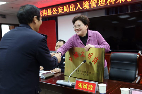12月26日,扶溝縣長張穎波向榮獲河南省“巾幗文明崗”的縣公安局出入境管理科授牌儀式在縣公安局九樓會議室舉行。副縣長任松奎,縣政府黨組成員、縣公安局局長田豪杰,縣公安局政委石偉等出席授牌儀式。
