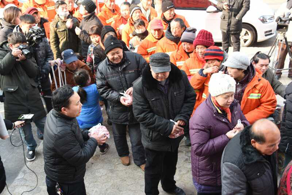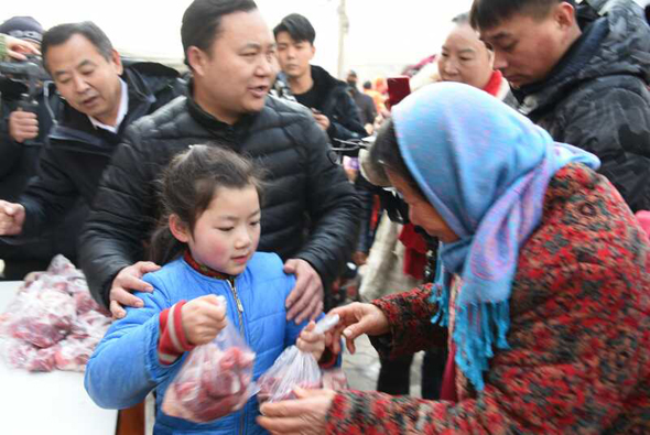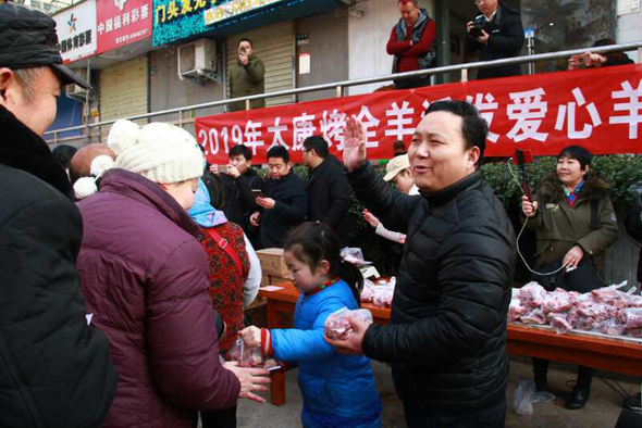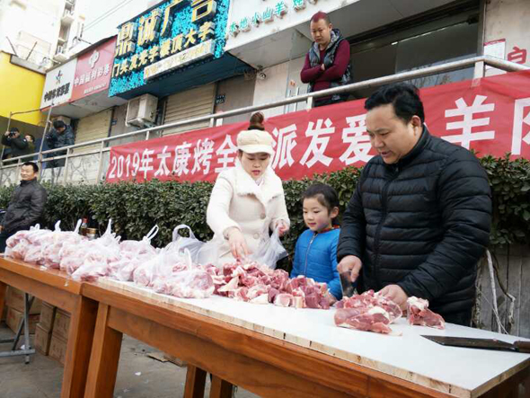 小小燒烤店門前,成了倡導“愛與奉獻主會場”。 2019年1月1日上午10點,新年第一天,鄭州市國基路與豐慶路交叉口太康烤全羊店門口,60多名環衛工、殘疾人、困難群眾等弱勢群體聚集在這里,排隊免費領取“羊肉哥”孫合理和妻子劉曉愛派送的一份新年禮物——愛心羊肉,而這愛舉從2010年元旦開始到如今,已經堅持了9年。