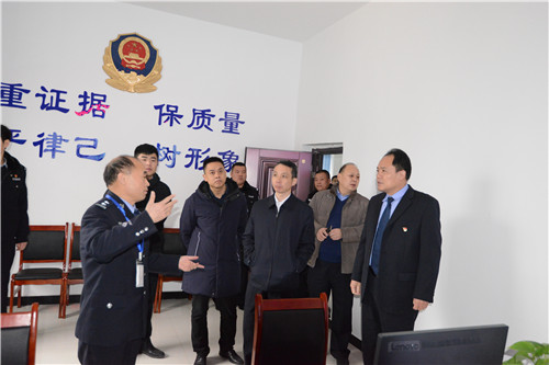 調研組一行深入鹿邑縣公安局新辦公業務用房工地、執法辦案中心、高集派出所新址等處實地調研基層建設工作。鹿邑縣副縣長、縣公安局長何新敏介紹了2018年鹿邑公安整體工作以及高質量公安建設有關情況。