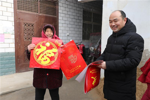 1月16日,西華縣艾崗鄉鐵爐村村民馬永清接過該縣縣委宣傳部駐村扶貧干部送來的春聯喜上眉梢。據了解,今年春節前夕,該縣財政投入200余萬元購置80萬副春聯在全縣鄉村范圍內廣泛開展贈春聯、送祝福活動。