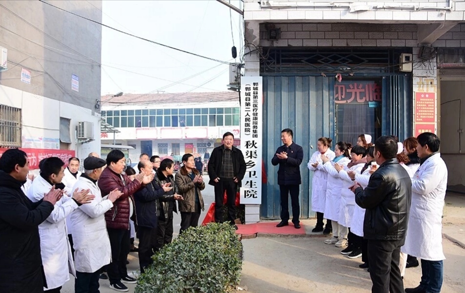 在秋渠鄉衛生院,晉繼忠與秋渠鄉黨委負責人梁輝為鄲城縣第三醫療健康服務集團(鄲城縣第二人民醫院)秋渠鄉衛生院揭牌。