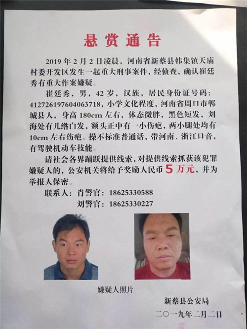 鄲城縣公安局接到新蔡縣發布的協查通報后,局長陳鳳祥,政委趙紅建,黨委委員、紀委書記梁家臣高度重視,立即組織相關警種成立專案組,在全縣范圍內開展排查工作,對已有線索進行梳理分析,對案情分析研判,確保犯罪嫌疑人崔某在我轄區出現后能第一時間發現,嚴防嫌疑人在逃竄期間再次作案。全縣大量公安民警、輔警放棄春節假期,夜日繼日地搜尋縣城街道、鄉鎮村莊、賓館旅店、田間地頭、廢棄房屋、建筑工地、溝壑涵洞等嫌疑人可能潛藏的地方,走訪群眾,張貼通告,摸排布控。2月7日中午,鄲城縣公安局雙樓派出所根據一村一警排查情況反饋,有疑似嫌犯的一男子在雙樓鄉廟集出現。雙樓派出所所長王云清立即帶領民警李鵬、陳寬,一村一警信超華來到嫌犯可能藏匿的飯店,開展化妝偵查,對比犯罪嫌疑人崔某照片確定無誤后,趁其不備,一舉將犯罪嫌疑人崔某成功抓獲,并當場從崔某身上繳獲刀子、農藥等物品。