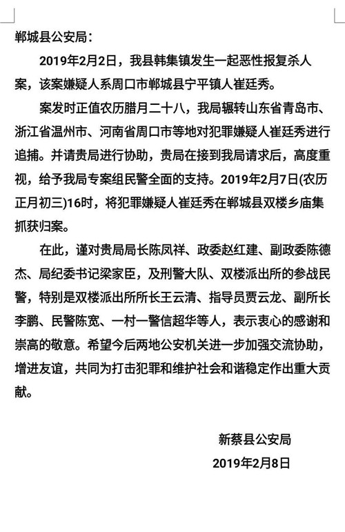 2月7日,在鄲城縣公安局局長陳鳳祥,政委趙紅建,黨委委員、紀委書記梁家臣的指揮下,鄲城縣公安局雙樓派出所經過多日連續工作,成功將駐馬店新蔡縣“2019.2.2”重大刑事案件犯罪嫌疑人崔某抓獲。