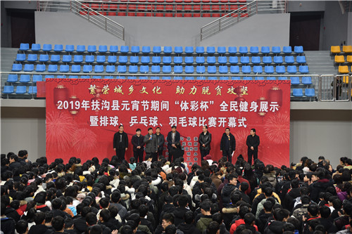 2月17日上午,元宵佳節即將來臨之際,在全縣脫貧攻堅沖刺的關鍵時期,扶溝縣2019年元宵節“體彩杯”全民健身展示暨排球、乒乓球、羽毛球比賽活動在縣體育館隆重開幕。活動旨在豐富全縣廣大人民群眾的文化生活,助力脫貧攻堅,為實現“五個扶溝”增光添彩。縣委常委、宣傳部長馬昭才,副縣長吳興華等出席開幕式。縣委宣傳部副部長張根主持開幕式。