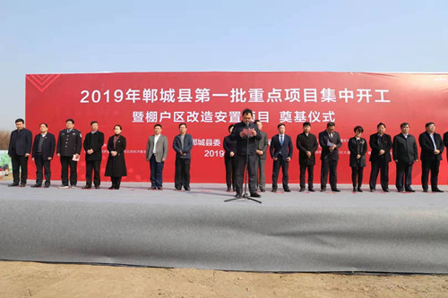 3月6日上午,鄲城縣舉行2019年全縣第一批重點項目集中開工暨棚戶區改造安置項目開工奠基儀式??h委書記羅文閣,河南中原建業城市發展有限公司董事長陳建業,總裁馬驍騰,縣長李全林,縣人大常委會主任李建軍,縣政協主席姜永來,縣委常委、常務副縣長王智華等出席開工儀式。