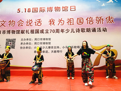 5月18日國際博物館日當天,周口市博物館舉行系列主題活動“如果文物會說話,我為祖國倍驕傲”詩歌朗誦活動、文物繪畫作品展活動。在活動現場,小朋友們帶來了精彩紛呈的節目,有根據市博物館的文物創作的詩歌作品《文物會說話:漢代玉豬》《文物會說話:戰國青龍玉佩》,有集體朗誦《中華頌》《初生的太陽》《我驕傲我是中國人》,還有獨唱、舞蹈、相聲、跆拳道、非洲鼓表演等,共同為本次活動增光添彩。