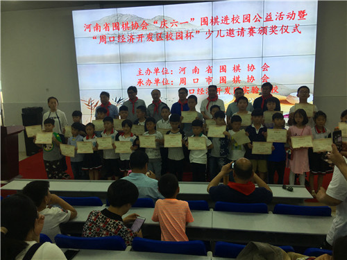 6月1日,省圍棋協會在周口經濟開發區實驗學校舉行慶“六一”圍棋進校園公益活動暨校園杯圍棋邀請賽。省圍棋協會副會長郭寶林、秘書長袁曦、副秘書長張新華,市工信委主任姚衛田,周口圍棋協會有關領導參加。