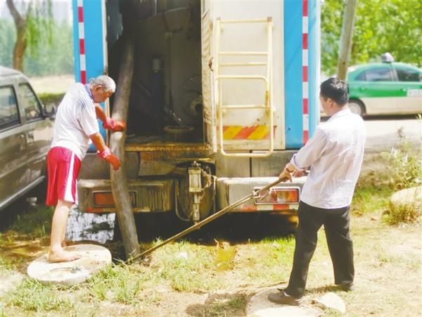 站在公廁旁的污水邊,該負責人指揮專門處理糞液的車輛到達現場,并就該公廁的情況向記者進行說明。“這個公廁是由市園林處負責修建的,建好投入使用的時候就沒有鋪設污水管道,只配套了一個能容納9立方米污水的化糞池。因為附近有小廣場,健身的市民多,公廁使用的頻率高,一個化糞池不夠用,我們又增加了一個能夠容納10立方米污水的化糞池,定期進行清理。”該負責人說。