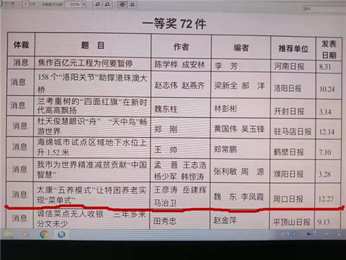 河南新聞獎是河南省新聞界最高獎。日前,經(jīng)過初評、復評、定評、公示等一系列環(huán)節(jié)后,《周口日報》二版頭題刊發(fā)的《太康“五養(yǎng)模式”讓特困養(yǎng)老實現(xiàn)“菜單式”》(作者:王彥濤 岳建輝 馬治衛(wèi) 編輯:魏東 李鳳霞)喜獲河南新聞獎一等獎,成為周口市唯一獲得一等獎的新聞作品。同時,《太康“五養(yǎng)模式”讓特困養(yǎng)老實現(xiàn)“菜單式”》還榮獲了中國地市報新聞獎二等獎,可謂“雙喜臨門”。