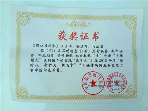 中國地市報新聞獎評選活動由中國地市報研究會主辦,每年舉辦一次,在全國有著廣泛的影響,此項新聞獎評選活動涉及全國幾乎所有地市黨報,不僅是展示地市黨報形象的重要舞臺,也是衡量地市黨報辦報水平的重要標志,同時也是以新聞的形式展示各地亮點工作的重要?!短怠拔屦B(yǎng)模式”讓特困養(yǎng)老實現(xiàn)“菜單式”》稿件在此項新聞獎評選中,同樣表現(xiàn)不凡,最終榮獲中國地市報新聞獎二等獎。