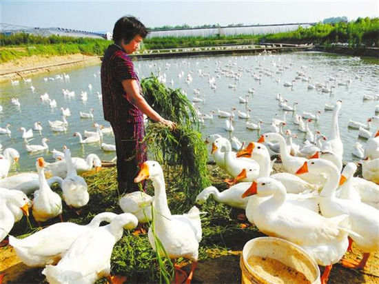 7月16日,沈丘縣周營鎮馬營村生態鵝養殖基地,工人正在喂養生態鵝。近年來,該鎮充分利用得天獨厚的生態環境優勢,積極引導群眾發展訂單生態土雞、肉鵝、槐山羊等特色養殖產業,全力促進農民增收致富。謝辛凌 攝