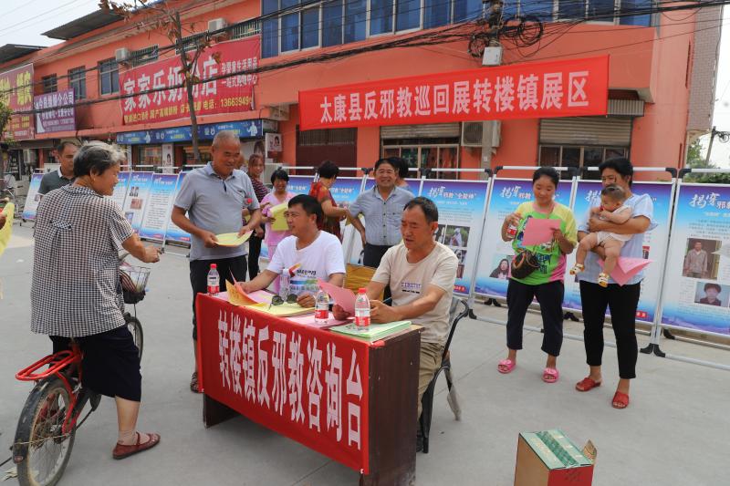 7月16日,太康縣反邪教巡回展在轉樓鎮開展反邪教宣傳活動。當日,轉樓鎮政府組織鎮綜治中心、派出所、司法所、中心校等單位,在轉樓大街布置展板、咨詢臺,接受群眾咨詢1000余人次,發放宣傳頁1000多份。 記者 馬治衛 通訊員 徐偉 攝