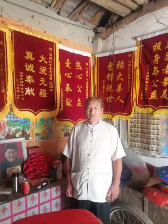 張同生今年65歲,發(fā)揚(yáng)雷鋒精神,處處奉獻(xiàn)愛心,自愿參加河南省紅十字會志愿者,建立救病扶困基金,為困難病人墊付醫(yī)療費(fèi),幫助病人聯(lián)系醫(yī)院、專家教授治病,辦理住院手續(xù),為病人干的好事實(shí)事,就像秋后熟透的葡萄—一串一串的。病人為他送的錦旗掛滿了3間堂屋,病人為他送的表揚(yáng)信少說也有半尺厚。