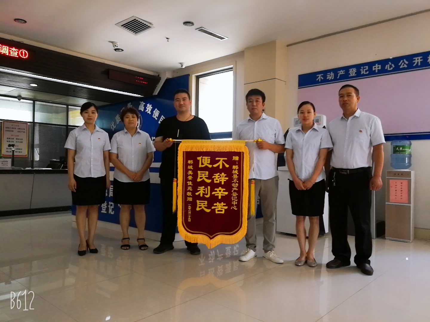 近日,河南博騏置業有限公司工作人員來到鄲城縣不動產登記中心,將一面印有“不辭辛苦,便民利民”的錦旗送到了中心負責人手中,對不動產登記中心真心為民的服務態度和高效的辦事效率表示感謝,點贊窗口“熱情、文明、高效”的服務。