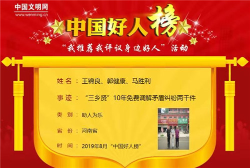 太康縣王錦良、郭健康、馬勝利在楊廟鄉成立幸福調解室,10年調解矛盾兩千件,成為各界美談。9月2日,8月份中國好人榜發布,該縣楊廟鄉幸福調解室“三鄉賢”同時榮登中國好人榜。截至目前,該縣入選“中國好人榜”已達60人。