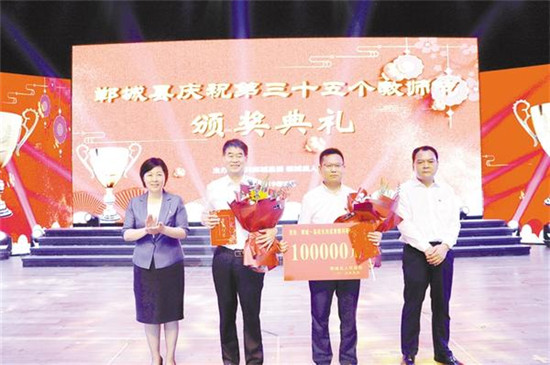 頒獎儀式上,該縣隆重表彰了2019年尊師重教先進單位、十佳師德標兵、最具影響力校長、先進小學幼兒園、先進初中、先進中心校、2019年高招目標管理先進單位、職業學校先進單位等。其中,獎勵鄲城一高教科研經費245萬元、獎勵鄲城二高教科研經費53萬元,授予縣教體局局長劉現營、鄲城一高校長劉成章2019年鄲城教育突出貢獻獎,并獎勵劉成章獎金10萬元。