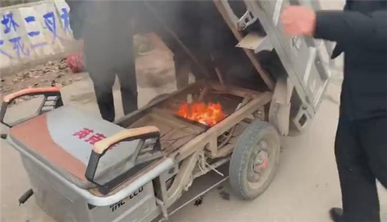 “當(dāng)時(shí)在我們前方的一輛電動(dòng)三輪車駕駛座下冒出黑煙,車上兩位老人察覺到危險(xiǎn)后,急忙下車,站在一旁不知所措。我們也緊跟上前。事發(fā)突然,現(xiàn)場(chǎng)沒有滅火器和可利用水源,而三輪車的火越來越大,兩位老人著急萬分,在旁邊不停地請(qǐng)求我們幫幫她們。根據(jù)經(jīng)驗(yàn),我們當(dāng)機(jī)立斷利用路邊的泥土進(jìn)行撲救,經(jīng)過幾十秒的緊張撲救,著火部位被成功撲滅。”三位消防隊(duì)員回憶說三輪車是電線短路引起的電瓶著火。