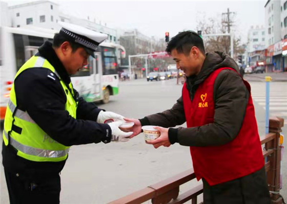 凌晨4時,志愿者便來到縣城南關愛心粥屋熬粥、炒菜,50多名志愿者6時便趕來拉著大桶的熱粥分赴老君臺、大隅首、北關另外三個志愿服務點,向環衛工人、交警、工地務工人員派迭香甜的臘八粥。
