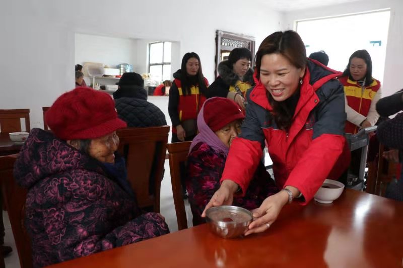 “開飯嘍!”中午時分,志愿者們將老人一一攙扶到餐廳坐下,隨后將一碗碗香氣四溢、且冒著熱氣的八寶粥端到老人跟前。“香,真香!”80歲的黃柏功老人舀了一勺八寶粥放到嘴里品了品笑著說。吃著八寶粥,老人想起了以前的艱苦生活,他禁不住激動地哭了起來:“以前,吃了上頓沒下頓,想吃一塊白面饃,都得等到過年。可現在,天天不斷肉,生活越來越好。這都是共產黨給咱的福啊。”