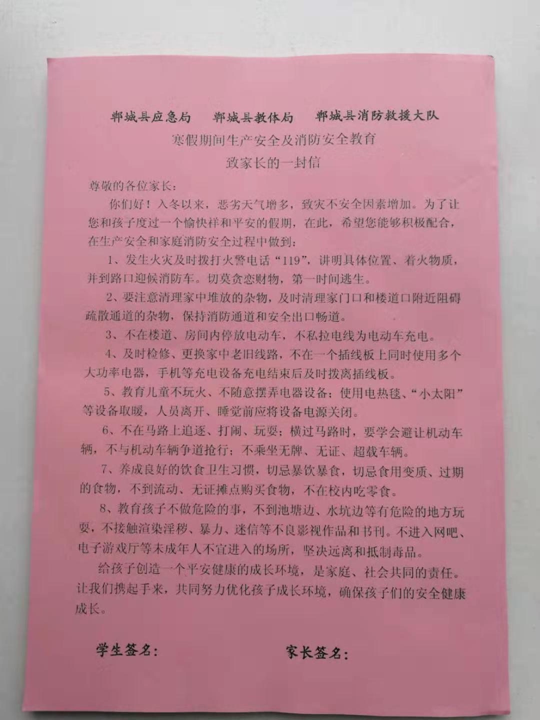 1月13日,寒假即將到來。鄲城縣為進一步加強春節(jié)期間的安全生產(chǎn)和消防安全工作,鄲城縣印制30萬份《寒假期間生產(chǎn)安全和消防安全教育致家長的一封信》,發(fā)放到全縣近30萬名中小學生手中,希望通過“小手拉大手”的形式,廣泛傳播生產(chǎn)安全和消防安全知識,確保全縣廣大人民群眾度過一個安全祥和的春節(jié)。