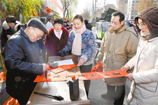 1月19日,由周口市民間文藝家協會、川匯區文聯聯合舉辦的“送萬福進萬家”義寫春聯活動,在周口華威民俗文化博物苑門前舉行。來自市書協、川匯區書協的20多名書法家現場揮毫潑墨,義寫春聯和“福”字,受到市民的一致好評。記者 梁照曾 攝