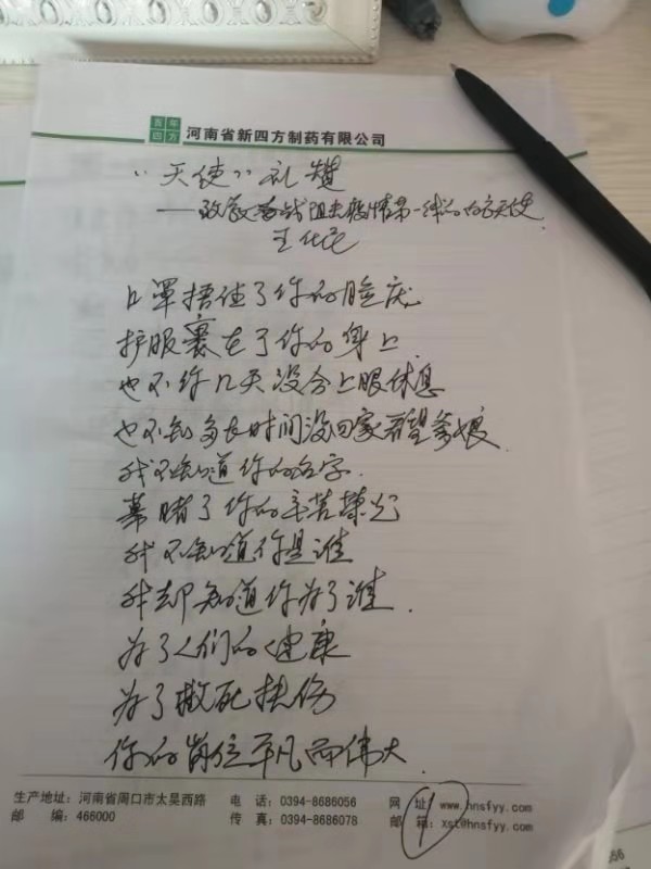 “阻擊疫情的陣容里你默默奉獻著熱和光你舍棄小家 顧著大家 心似蓮花 情滿海洋”1月30日,50多歲愛好寫詩的周口市民王化民致電記者,為了表達對奮戰在疫情一線白衣天使的崇敬,他特意寫了一首詩歌來禮贊。
