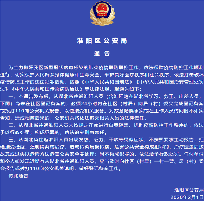 今天,淮陽區公安局發通告:從湖北返淮人員務必24小時內……