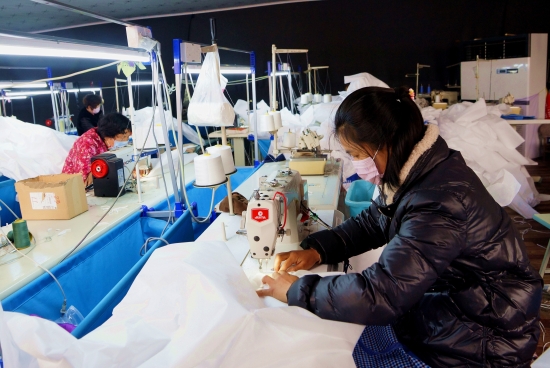 2月25日,項城市南頓鎮水牛劉行政村扶貧車間內,幾名工人正忙著加工醫用防護服。疫情期間,為保障需求,該車間已經加班加點完成了2000套醫用防護服的訂單任務。