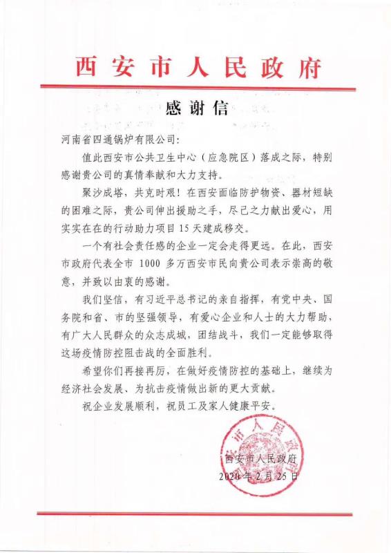 “聚沙成塔,共克時艱!在西安面臨防護物資、器材短缺的困難之際,貴公司伸出援助之手,盡己之力獻出愛心,在此西安市政府代表全市1000多萬西安市民向貴公司表示由衷的感謝”。這是西安市政府對太康縣拔尖人才、河南省四通鍋爐有限公司總經理馮坤的感謝信。一方有難,八方支援。在新聞上了解到武漢新冠肺炎疫情突發的情況后,他連夜與中國紅十字會和武漢紅十字會取得聯系,詢問向新建的火神山醫院捐贈醫用鍋爐和捐款事宜,通過網上銀行將30萬善款轉入武漢紅十字會賬戶中。