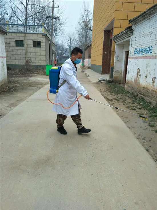 他不是為村民分發消毒液,就是對村主干道、公共衛生間每天堅持消毒,雙腿累腫了,嘴唇起了泡,可他咬牙堅持。村委成員見他每天像個陀螺一樣高速的運轉著,讓他休息幾天,可楊建崗說啥也不同意。每天還是堅持著值班,發現問題及時糾正,對有些不理解的村民進行說服教育。除了值班,他還與其他志愿者一起做好流動崗,發現有扎堆的村民立即勸阻,發現有不戴口罩者一律勸回,對亂走親戚的村民堅決說“不”。