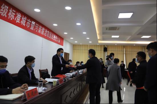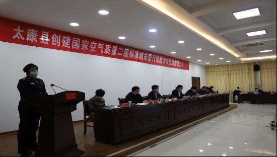 縣委常委、縣紀委書記、縣監委主任何明照宣讀《太康縣2020年大氣污染防治攻堅戰責任目標考核獎懲辦法》。縣委常委、縣委辦公室主任張雪芳宣讀《中共太康縣委 太康縣人民政府關于成立創建國家空氣質量二級標準城市指揮部的通知》。副縣長司春榮全面總結2019年全市污染防治攻堅戰工作,安排部署創建國家空氣質量二級標準城市工作任務。