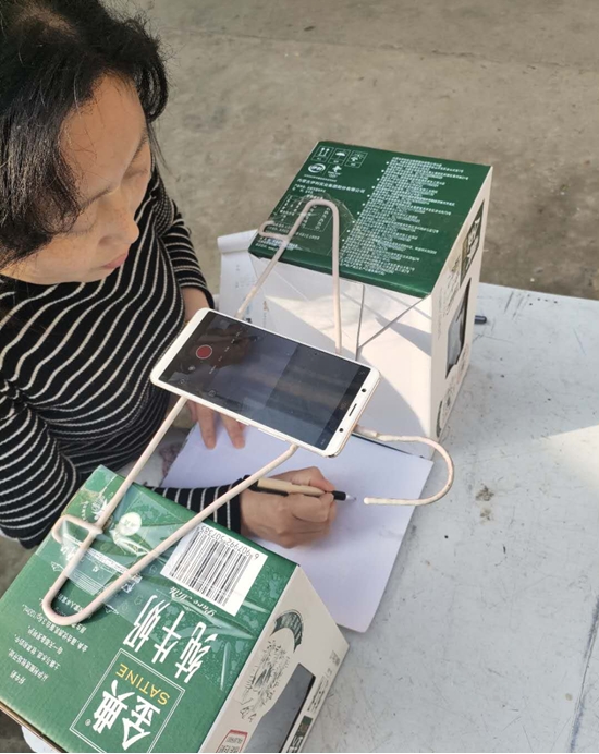 在備課時,朱霞很快遇到了難題:手機沒法固定,街上手機店又全部停業,網上買的手機固定夾發不了貨。為了不耽誤學生上課,她想到用晾衣撐、牛奶箱做成簡易支架,組裝后居然效果不錯。就這樣,一個晾衣撐、兩個牛奶箱和一部手機組成了她的“三尺講臺”。