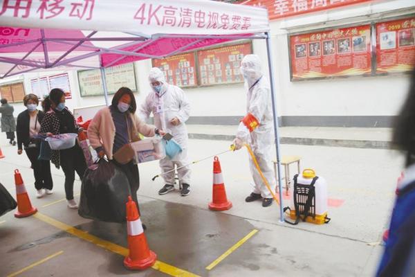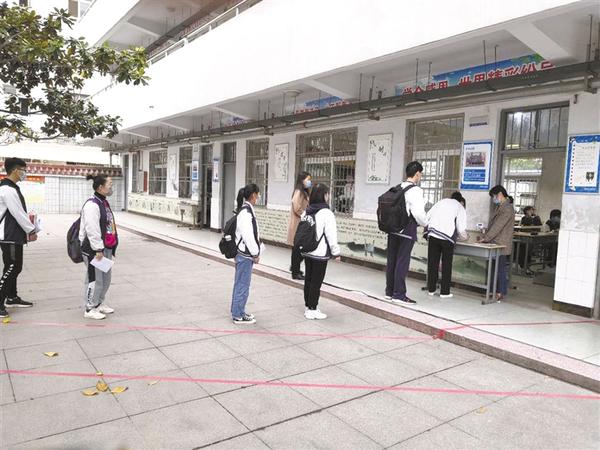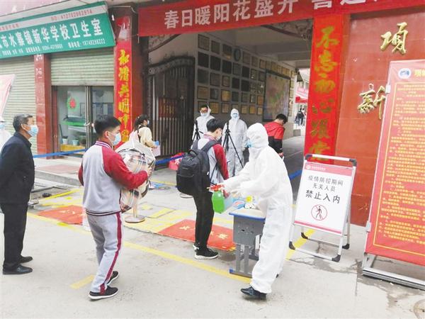 4月20日6時50分,記者在周口四中門口看到,學生們在家長的陪伴下陸續趕來,按照學校提前下發的入校流程,在校門口間隔一米距離有序排隊。然后,他們按規定依次遞交健康承諾表后,在值班教師的引導下,通過大門兩側設置的體溫測試通道入校,每個通道處都有工作人員負責引導學生、噴灑消毒液。