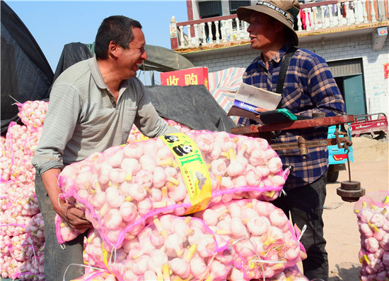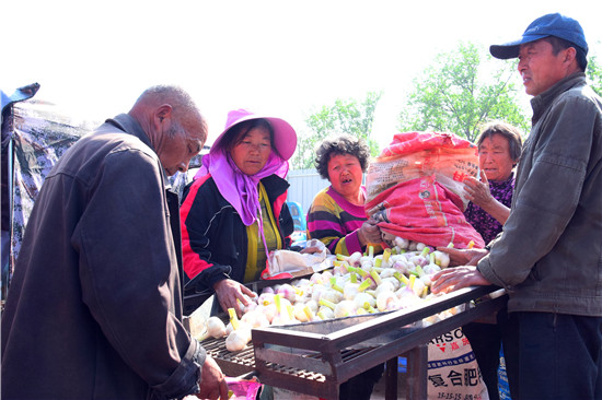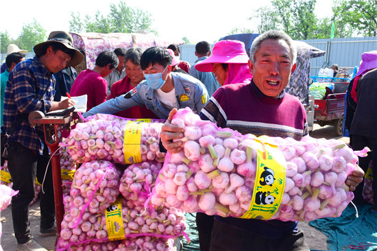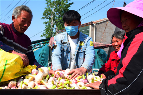 4月26日下午,記者在淮陽縣王店鄉107國道沿線看到,各個大蒜的收購點車來車往,蒜農們拉著新蒜賣給小販們。盡管今年春季雨水較少,天旱土地墑情較差,但是上萬畝大蒜,在蒜農們施肥澆水管理下,長勢不錯,每畝產量在3000斤到4000斤之間,迎來疫情下的大蒜豐收。