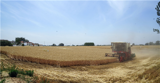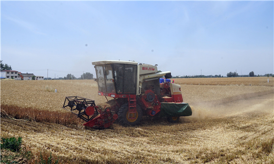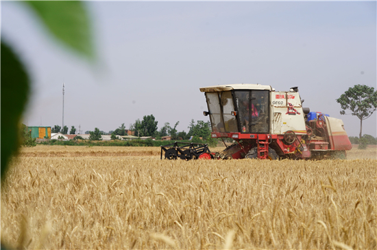 5月28日,在周口市西華縣遲營鄉前喜村,農民駕駛收割機在田間收割小麥。 眼下,周口市近千萬畝小麥陸續開鐮收割,當地農民搶抓農時收割小麥,確保顆粒歸倉。 記者 金月全 攝