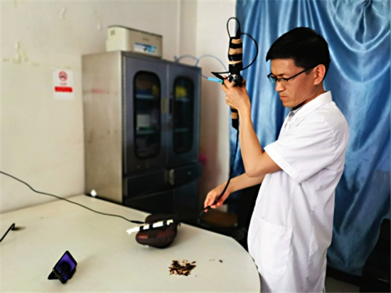 “這是氣管鏡,這是顯示屏,這是氣管,這是模擬人的胸部。”6月5日上午,在市婦幼保健院南院區兒科診室內,該科醫生徐公彥拿著自制的模擬呼吸內鏡向記者演示。