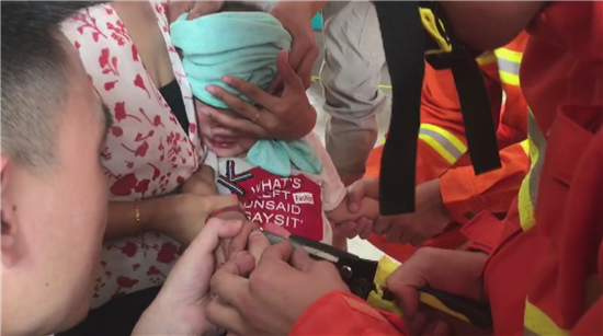 到達現場經詢問得知,小男孩由于貪玩,將一個細長鋼管卡在了右手大拇指上,小男孩的家人嘗試了一些方法無果后,向消防救援大隊請求了幫助。由于時間稍長,小男孩的手指已經浮腫,不停的哭泣,消防指戰員一邊尋求解決方法一邊安慰其情緒。經觀察后,指戰員首先利用斷線鉗將鋼管剪斷,然后用擴張器小心翼翼的進行擴張,經過2分鐘緊張救援,成功將鋼管取下。