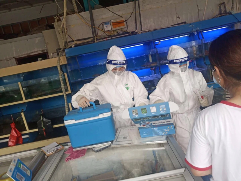 當日,分別對6月14日排查中發現的一箱三文魚、銷售三文魚的電子秤、分割案板等相關器具進行了核酸檢測,隨后又對周邊經營進口凍品的人員及相關產品也進行抽樣檢測。抽樣完畢后,市場監管分局執法人員繼續對市場內的水產品批發經營區進行檢查,查看商戶的相關資質和經營環境,檢查了海鮮類產品的進貨渠道及相關檢疫證明等,共計檢查海鮮商戶5戶、凍品商戶7戶、水產區商戶8戶,未發現由北京新發地市場進口的三文魚類海鮮產品及國外重點疫區進出口水產品。