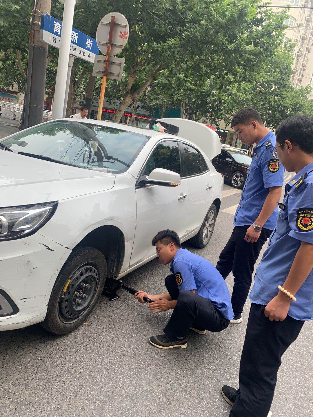 “我?guī)Ш⒆踊丶业穆飞希瑳]想到汽車突然爆胎,天太熱了,孩子還小,一直哭鬧,我完全不知道該怎么辦。”女車主著急地向城管隊(duì)員講述了遇到的突發(fā)狀況。了解情況后,周自新、龐博、康棟棟、宋俊峰等隊(duì)員對(duì)女車主安撫后,在車前后設(shè)置安全警示、疏通交通。得知車上有備胎后,隊(duì)員們找出工具和備胎,決定更換輪胎。十分鐘后,車胎更換完畢,女車主十分感動(dòng),連聲感謝。