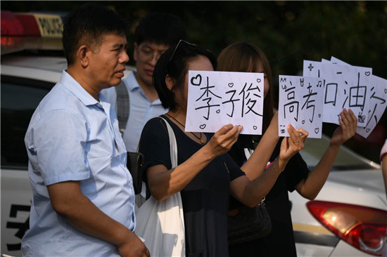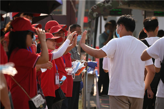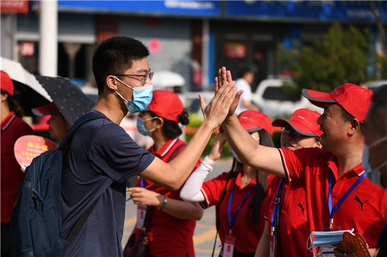 祝愿學子們考出好成績,今夏實現金榜題名,是全社會共同的心聲。7月7日上午8點多,2020年高考開啟神圣時刻,和往年不同的是,因疫情影響,學子們帶著口罩入場,作為外援的家長們,更是悉數趕到考場外,為孩子們加油!而辛勤一年的老師們,更顧不上歇一會兒,也趕到考場外,為學生擊掌打氣,構成周口考場外動人的圖景。圖為市一高考場外的家長們舉著加油的牌子,為孩子助威!一高的老師穿上小紅馬甲,當志愿者,和進場的學生擊掌助威!