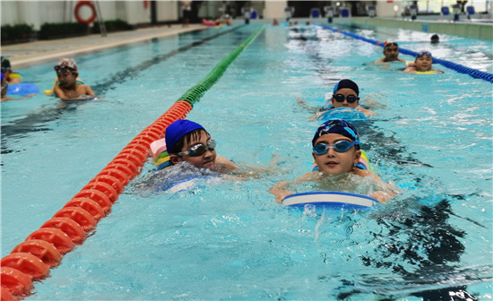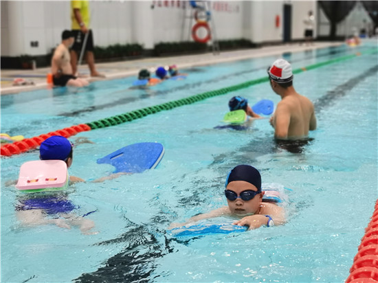 7月9日,不少孩子們在游泳館內游泳嬉戲。暑假開始了,孩子們開始了豐富多彩的假期生活,有不少孩子來到游泳館,在碧水中游戈,快樂健身。許多家長認為,游泳除了可以讓孩子健身、消暑外,還能提高孩子的自救能力。