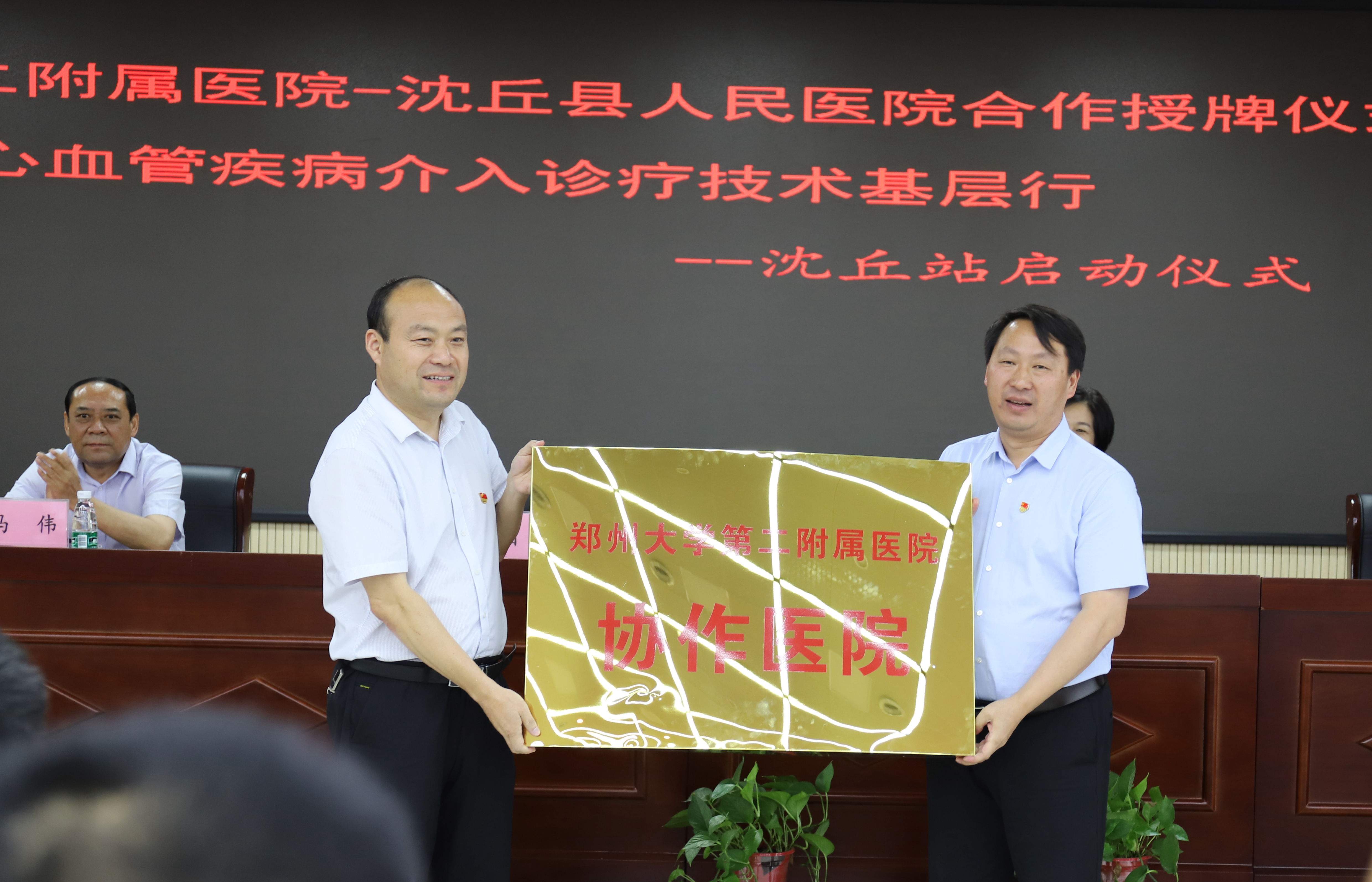 隨后,鄭大二附院副院長簡立國為沈丘縣人民醫院授協作醫院牌。沈丘縣人民醫院院黨委書記歐陽劍為鄭大二附院的簡立國院長及心血管內科各位教授專家頒發特聘專家證書。沈丘縣衛健委張治君在總結講話中指出,縣醫院與鄭州大學第二附屬醫院建立友好協作關系,不僅對縣醫院是個很好的發展機遇,也是該縣醫療衛生工作走大靠強道路的具體體現,是醫療衛生戰線上的一件大喜事,對加快醫療衛生事業發展,有效的解決廣大人民群眾看病貴、就醫難的問題,將起到積極的推動作用。希望鄭州大學第二附屬醫院的領導和專家們常來指導,兩家醫院能夠友好協作,共同發展。
