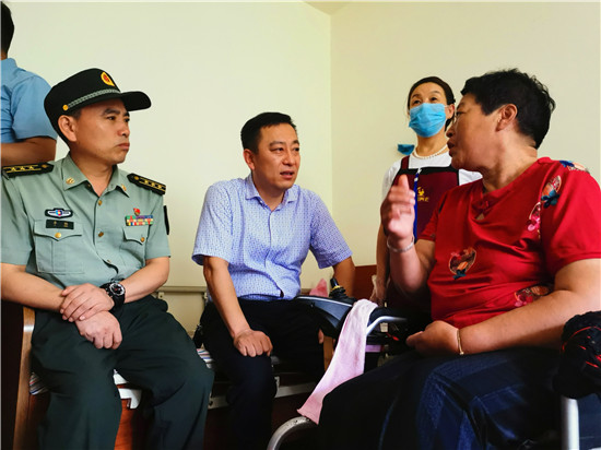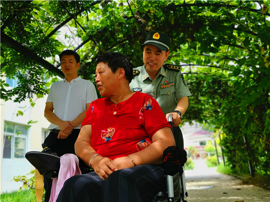 走進(jìn)位于太昊路上的周口市老年護(hù)理院,院內(nèi)整潔有序、花蕊吐香鳥鳴聲聲,小徑通幽處的涼亭內(nèi)三五老人打牌、聊天,一副愜意安詳?shù)纳顖?chǎng)景。在侯國(guó)領(lǐng)母親王玉勤居住的房間內(nèi),李揚(yáng)、孫光濤等人坐在床邊與她聊天談心,看到這么多人來慰問她,王玉勤眼中流下了感動(dòng)的眼淚,她對(duì)慰問人員表示感謝,說自己來護(hù)理院近一年來,吃住條件都不錯(cuò),護(hù)理院照顧的無微不至,身體一天天恢復(fù),閑暇時(shí)還能不依賴輪椅自己走上一段路。她激動(dòng)地說:“感謝黨和政府的親切關(guān)懷,我最大的愿望是希望倆兒子永遠(yuǎn)聽黨的話,在部隊(duì)安心服役、再立新功,用優(yōu)異的成績(jī)回報(bào)黨和政府對(duì)我們?nèi)业年P(guān)愛?!?/p>