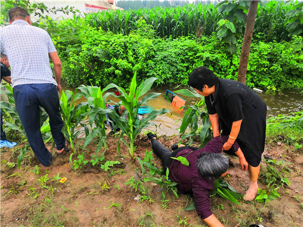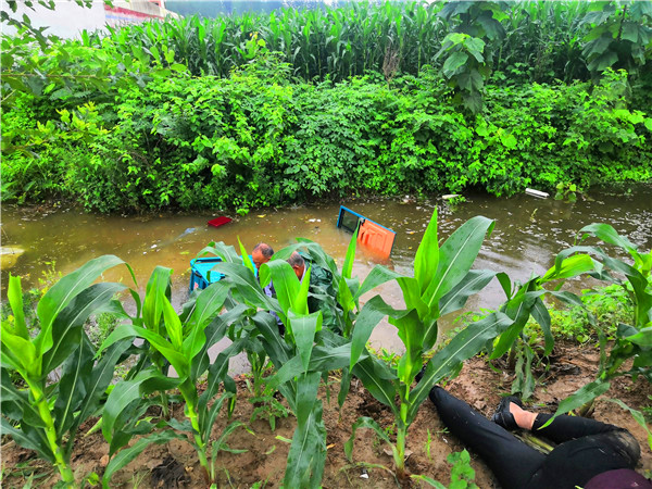 7月26日,連續多日的降雨已導致農村坑滿河平、積水頗深。當日下午4時,依然時雷聲陣陣、雨如豆粒,二人在宜路鎮張寨村小學附近的玉米田間拍照核查“圖斑”時,看到一輛車箱內載有幾位老人的電動三輪車冒雨從路邊疾駛過去。緊接著聽到“撲通”一聲,趙文波、李偉二人立即意識到是三輪車掉進路溝、落水了。