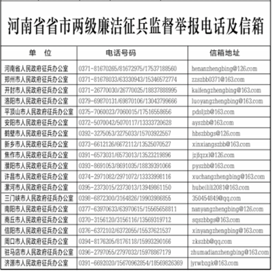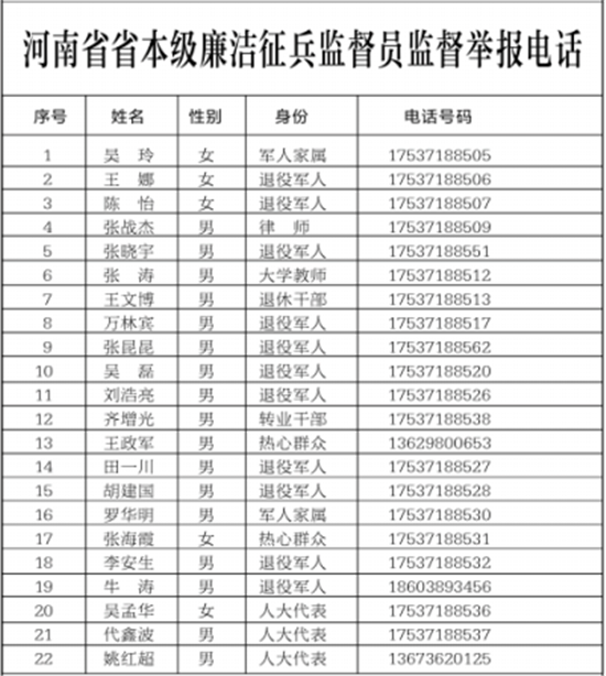為扎實做好河南省廉潔征兵工作,切實維護廣大應征青年合法權益,確保為國防和軍隊建設輸送優質兵員,現將省本級廉潔征兵監督員和省市兩級廉潔征兵監督舉報方式予以公示,歡迎社會各界對征兵工作予以監督。征兵工作政策法規請關注“河南征兵”微信公眾號。