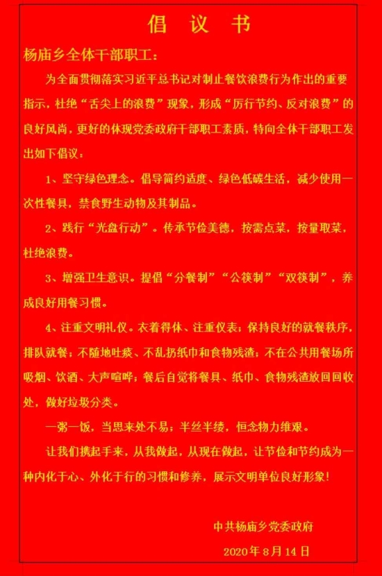 據楊廟鄉黨委書記聶運亨介紹,該鄉積極響應總書記號召,向全鄉干部發出了堅守綠色理念、踐行光盤行動、增強衛生意識、注重文明禮儀等四個方面的倡議,讓全鄉干部從我做起,從現在做起,使勤儉節約成為習慣和修養。
