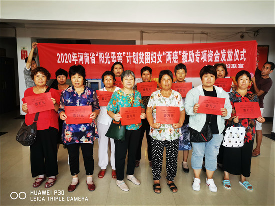 據悉,此次發放的公益金來自于河南省陽光母親貧困婦女兩癌救助金。其救助對象是經過有檢查資質的醫療機構確診、患有宮頸癌ⅡB以上或浸潤型乳腺癌的農村貧困婦女,救助標準為每人一次性救助1萬元。