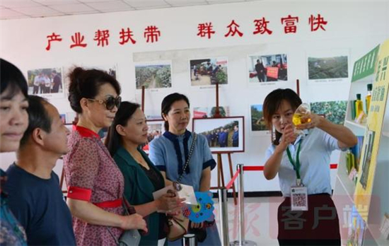 在光山縣槐店鄉司馬光油茶園的河南聯興油茶公司的展廳內,講解員正在給游客介紹油茶產品。劉宏冰 攝
