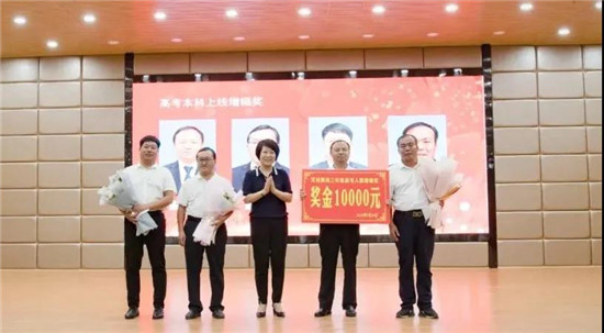 與會領導為40名本科上線增幅獎、標兵教師、新銳獎、優秀學科組等獲獎教師代表頒獎、獻花,并合影留念。